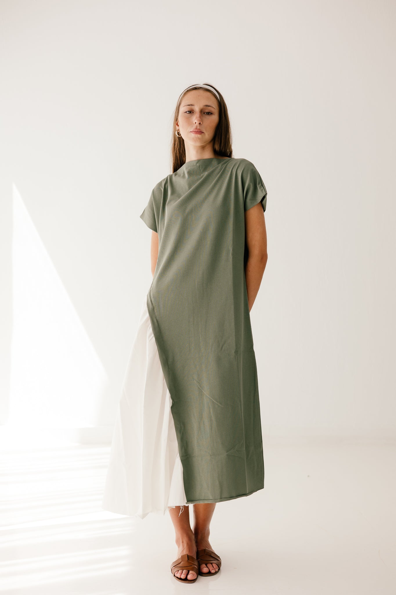 Half sleeves Melton x poplin dress in Olive